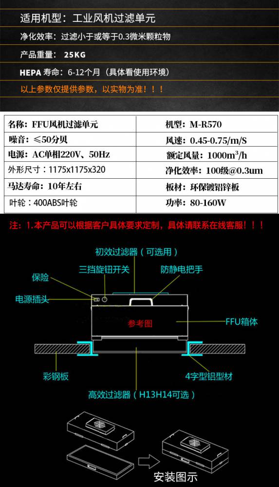 FFU風機過濾機組控制采用其公司開發之非接觸感應式三檔調速,電路均采用電器開關控制,控制安全平穩。彈性、多元化配置除標準機型外,可根據客戶需求,制作不同規格的非標產品。如:風管連接法蘭、濾網、箱體材質等變更。人性化設計機組附裝不銹鋼把手,使搬運及安裝更為方便快捷。