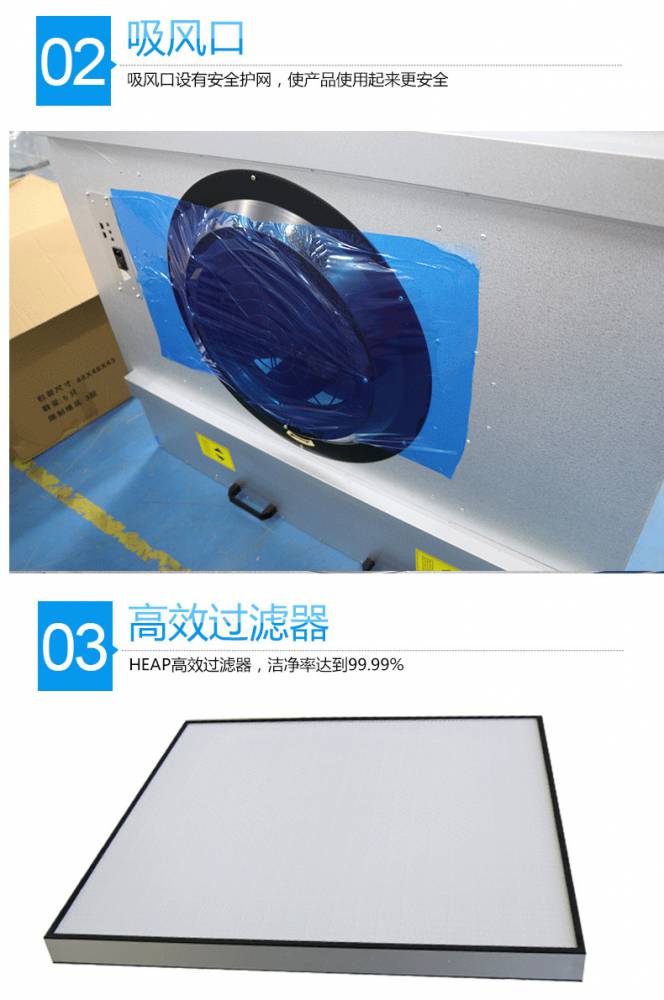 FFU風機過濾機組控制采用其公司開發之非接觸感應式三檔調速,電路均采用電器開關控制,控制安全平穩。彈性、多元化配置除標準機型外,可根據客戶需求,制作不同規格的非標產品。如:風管連接法蘭、濾網、箱體材質等變更。人性化設計機組附裝不銹鋼把手,使搬運及安裝更為方便快捷。