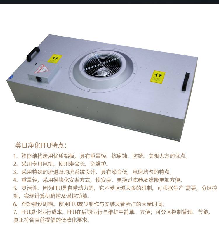 FFU風機過濾機組控制采用其公司開發之非接觸感應式三檔調速,電路均采用電器開關控制,控制安全平穩。彈性、多元化配置除標準機型外,可根據客戶需求,制作不同規格的非標產品。如:風管連接法蘭、濾網、箱體材質等變更。人性化設計機組附裝不銹鋼把手,使搬運及安裝更為方便快捷。