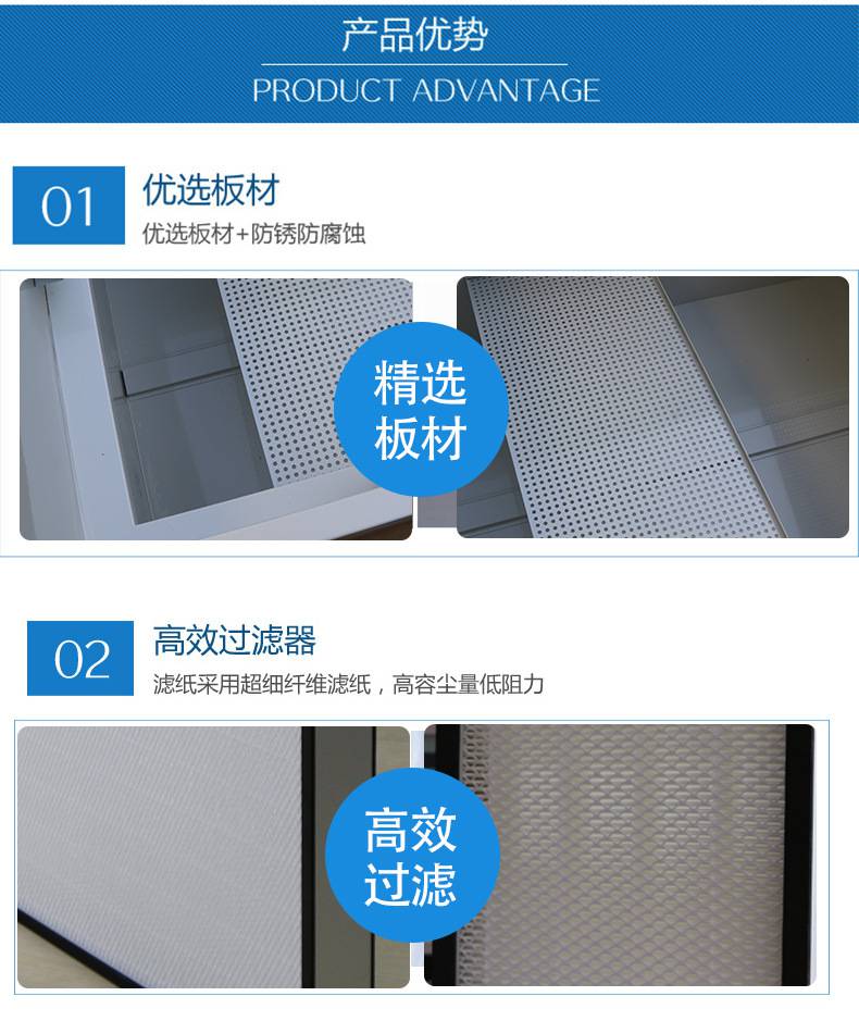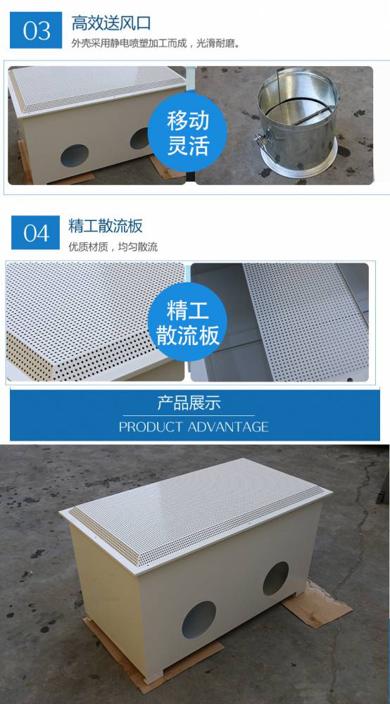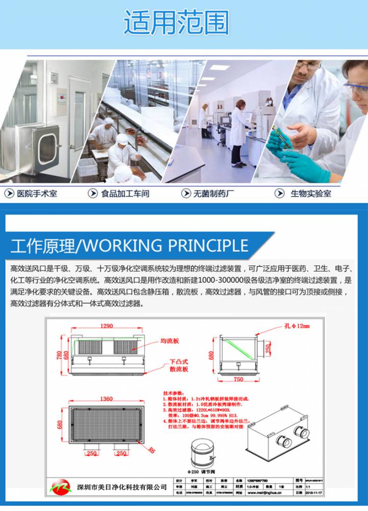 高效送風口為千級、萬級、十萬級凈化空調系統較為理想的終端過濾裝置,可廣泛于醫藥、衛生、電子、化工等行業的凈化空調系統。高效送風口是用作改造和新建1000-300000級各級潔凈室的終端過濾裝置,是滿足凈化要求的關鍵設備。高效送風口包含靜壓箱,散流板,高效過濾器,與風管的接口可為頂接或側接。