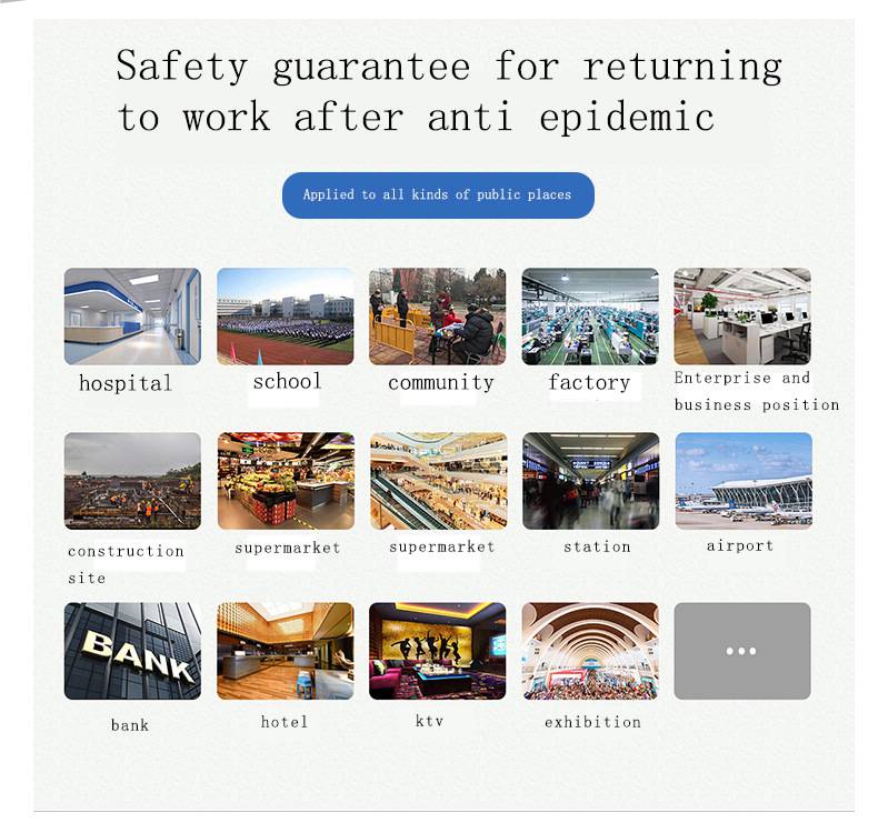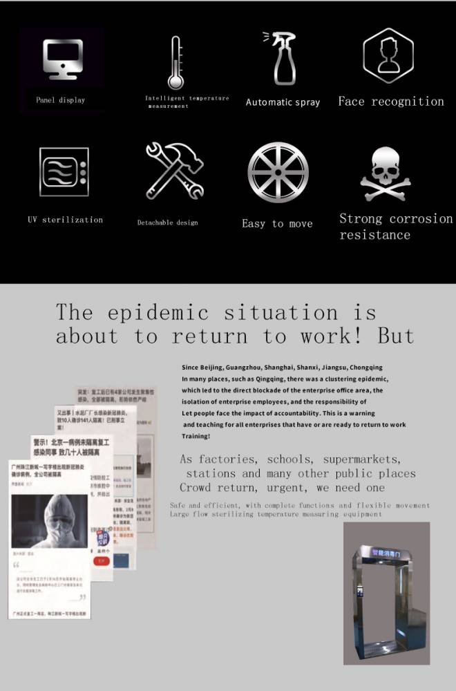 消毒溶液采用食品級,對通過的人員以及物品進行非接觸式消毒,同時可以通過添加人體測溫報警器和熱成像體溫檢測儀對人員進行體溫檢測。