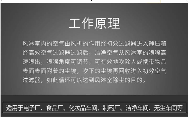 風淋室是一種通用性較強的局部凈化設備,安裝于潔凈室與非潔凈室之間。當人與貨物要進入潔凈區時需經風淋室吹淋,其吹出的潔凈空氣可去除人與貨物所攜帶的塵埃,能有效的阻斷或減少塵源進入潔凈區。風淋室/貨淋室的前后兩道門為電子互鎖,又可起到氣閘的作用,阻止未凈化的空氣進入潔凈區域。