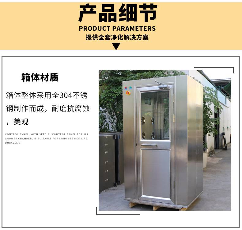 風淋室是一種通用性較強的局部凈化設備,安裝于潔凈室與非潔凈室之間。當人與貨物要進入潔凈區時需經風淋室吹淋,其吹出的潔凈空氣可去除人與貨物所攜帶的塵埃,能有效的阻斷或減少塵源進入潔凈區。風淋室/貨淋室的前后兩道門為電子互鎖,又可起到氣閘的作用,阻止未凈化的空氣進入潔凈區域。